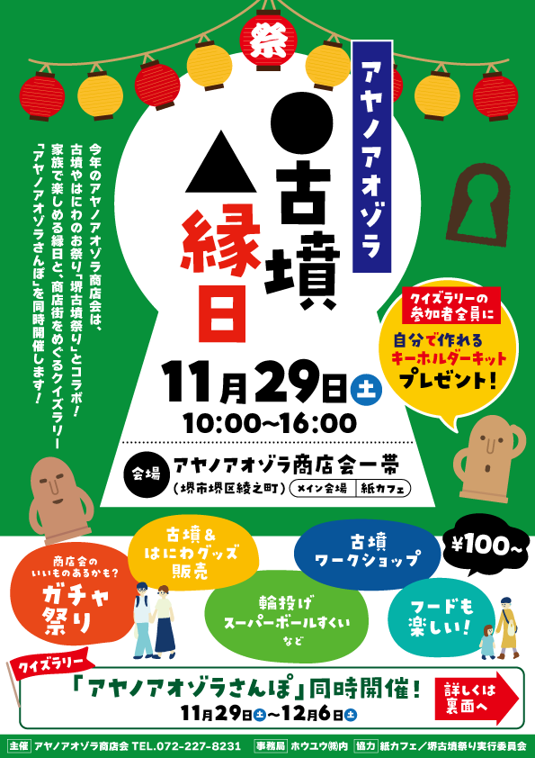 紙カフェも所属するアヤノアオゾラ商店会では、古墳やはにわのお祭り「堺古墳祭り」とコラボした秋のイベント「アヤノアオゾラ●古墳▲縁日」を、11月29日(土)10:00~16:00に開催します!